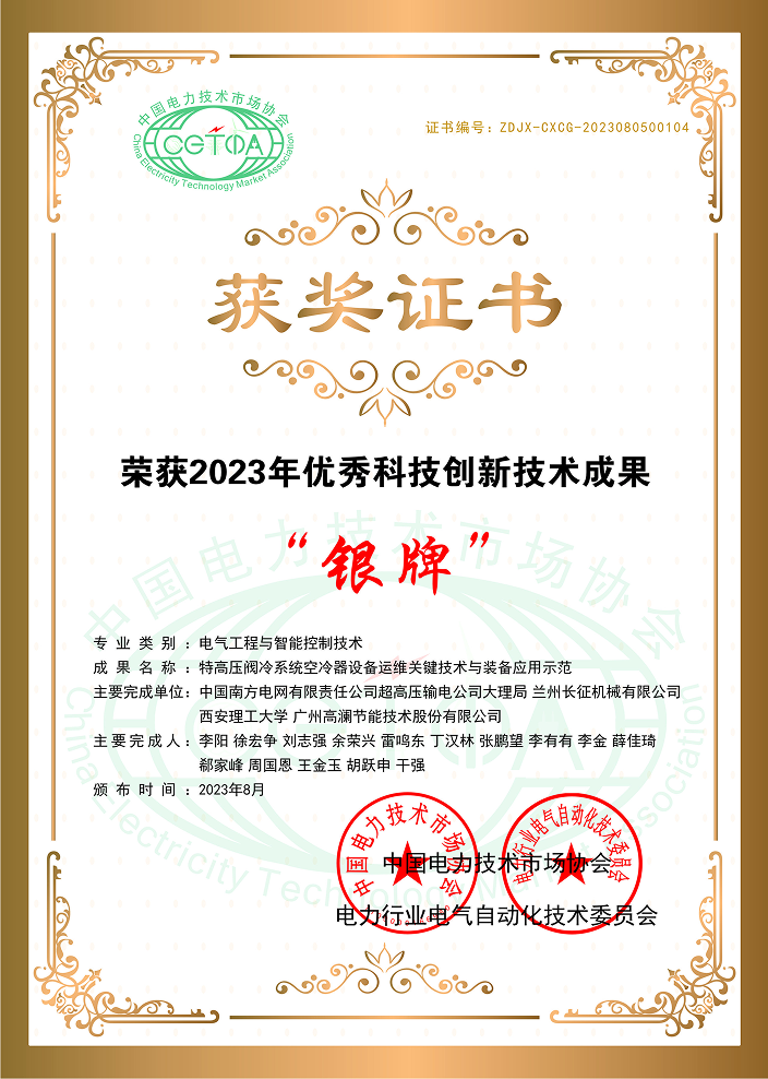 中國電力技術(shù)市場協(xié)會、電力行業(yè)電氣自動化技術(shù)委員會2023年優(yōu)秀科技創(chuàng)新技術(shù)成果“銀牌”