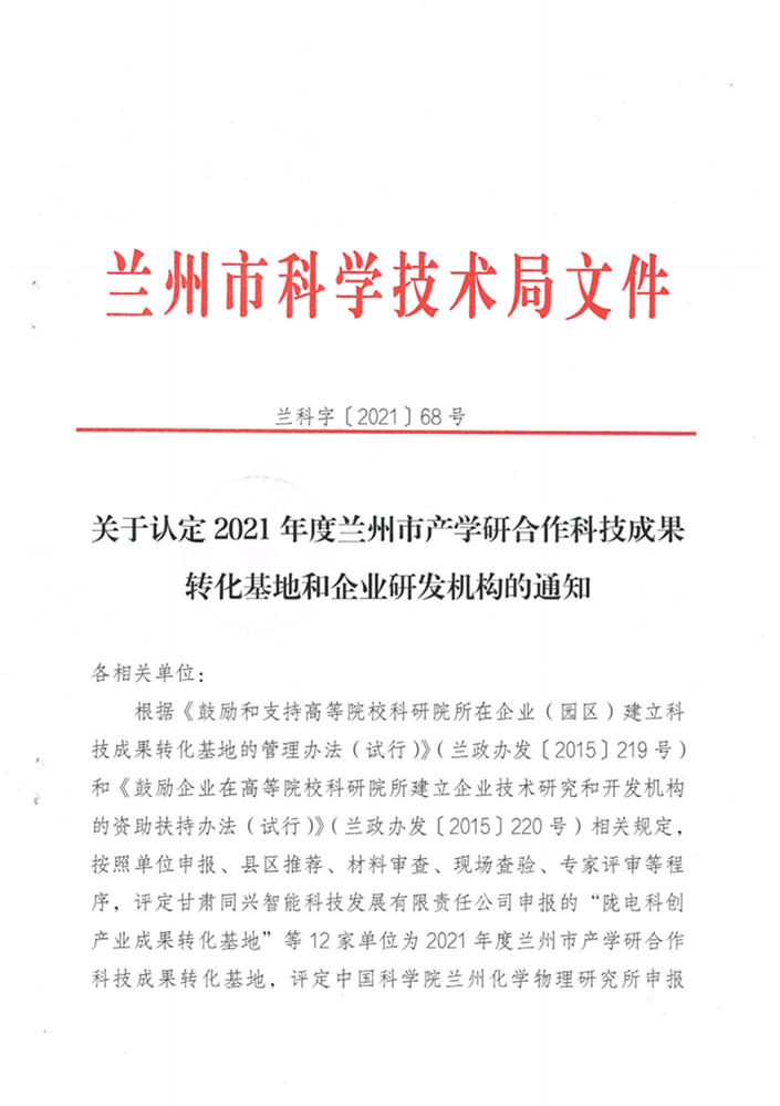 蘭州市科技局認定科技成果轉(zhuǎn)化基地